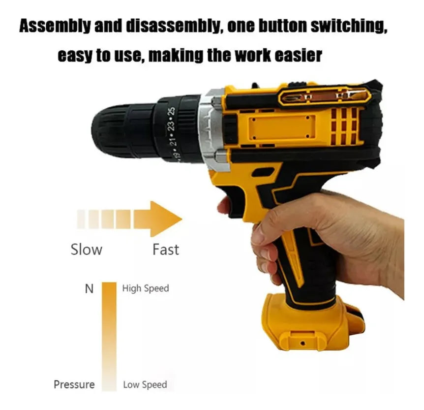 Potente y Duradero: Nuestro taladro inalámbrico de 98W cuenta con una capacidad de perforación eficiente y un rendimiento superior en disipación de calor, lo que permite un uso prolongado sin sobrecalentamiento. Su diseño de CVT (transmisión continua variable) elimina la necesidad de cambios de marcha, proporcionando una experiencia de perforación más fluida.